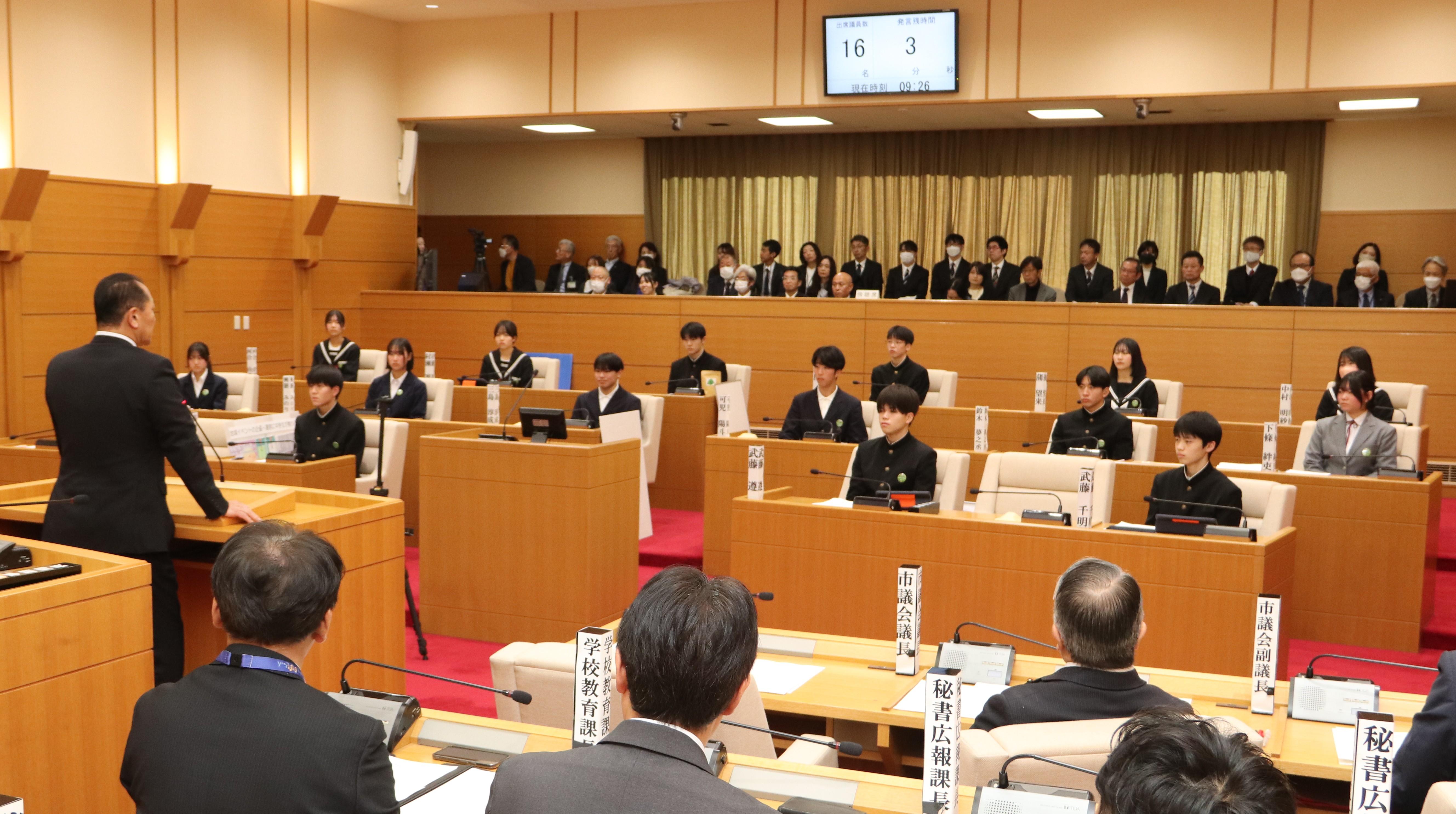 中学生ふれあい懇談会は、将来の郡上市の担い手である中学生の市や市政への思いや意見を把握するとともに、郡上市政への関心を高めることを目的に開催しています。市内の中学校から選出された生徒が、テーマに沿って市を活性化するための提案などを発表し、提案に対し市長が考えを述べたり生徒からの質問を受けるなど意見交換を行います。