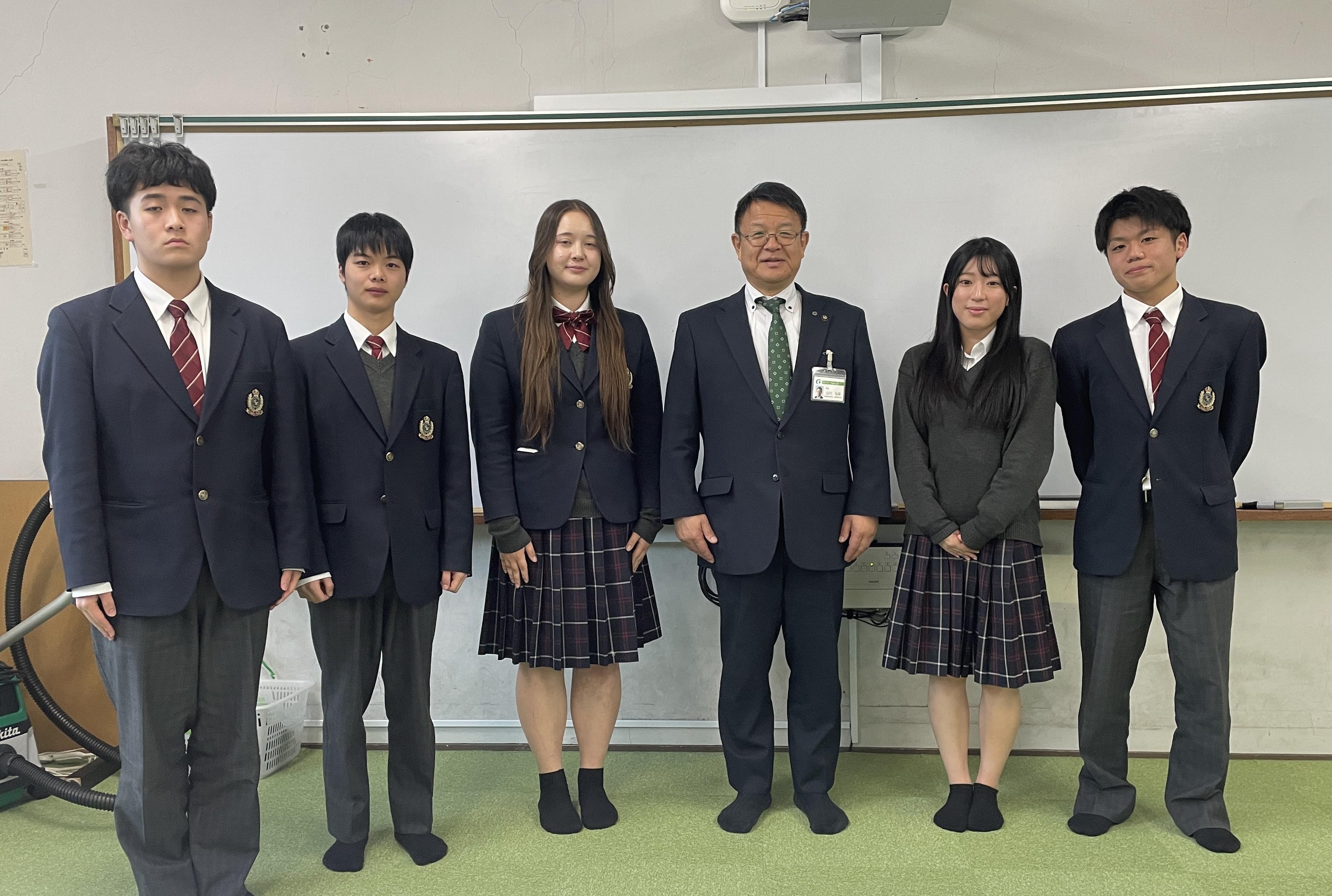 5名の生徒は、若い世代が「市の歌」に関心が低いことを課題と捉え、自らの吹奏楽による合奏で市を盛り上げたいという思いで取り組まれました。その取組みは令和3年度(当時2年生)に始まりましたが、コロナ禍によりこの度の完成報告となりました。