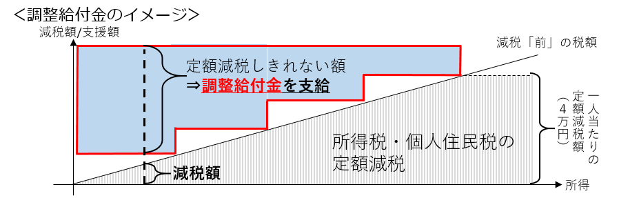 ⇒減税額は所得税が3万円、住民税所得割が1万円ですが、実際に減税されるのは所得税から1万円、住民税所得割が1万円です。